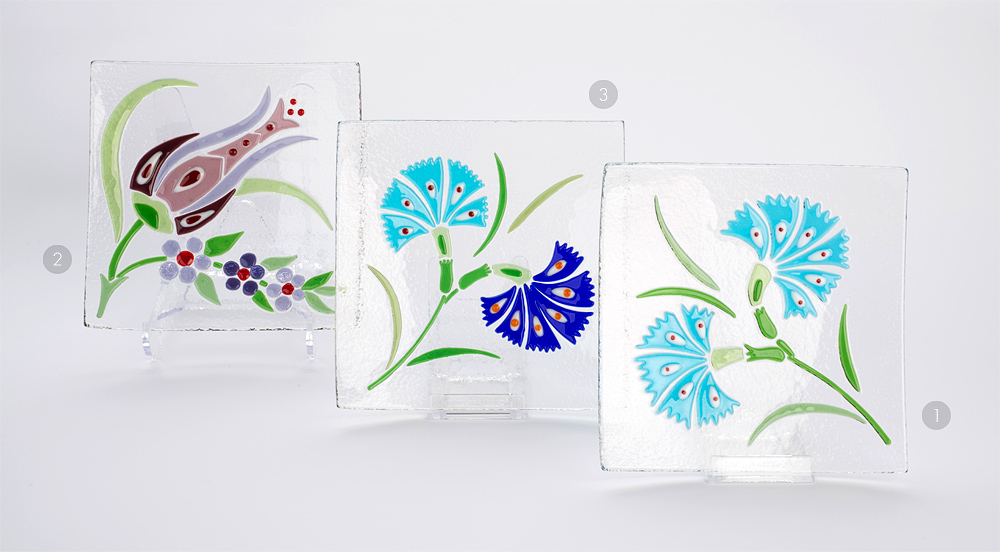 TILSIMLI OBJELER Koleksiyonundaki tasarımlar ithal renkli camların el ile kesilip üst üste dizilmesi ve özel bir fırında 800 C° de 14 saatten fazla bir sürede pişirilmesi tekniğiyle elde edildiler. Bu farklı tasarım objeler, cam işleme sanatının beşiği sayılan Mezopotamya ve Mısır’da M.Ö. 4000 yılında başlamış bir serüvenin devamı niteliğini taşımaktadır. Bu gruptaki tasarımlar geleneksel Osmanlı çiçek motifleri kullanılarak yapılmıştır. Dekoratif objelerin ebatları 20cm*20cm dir.