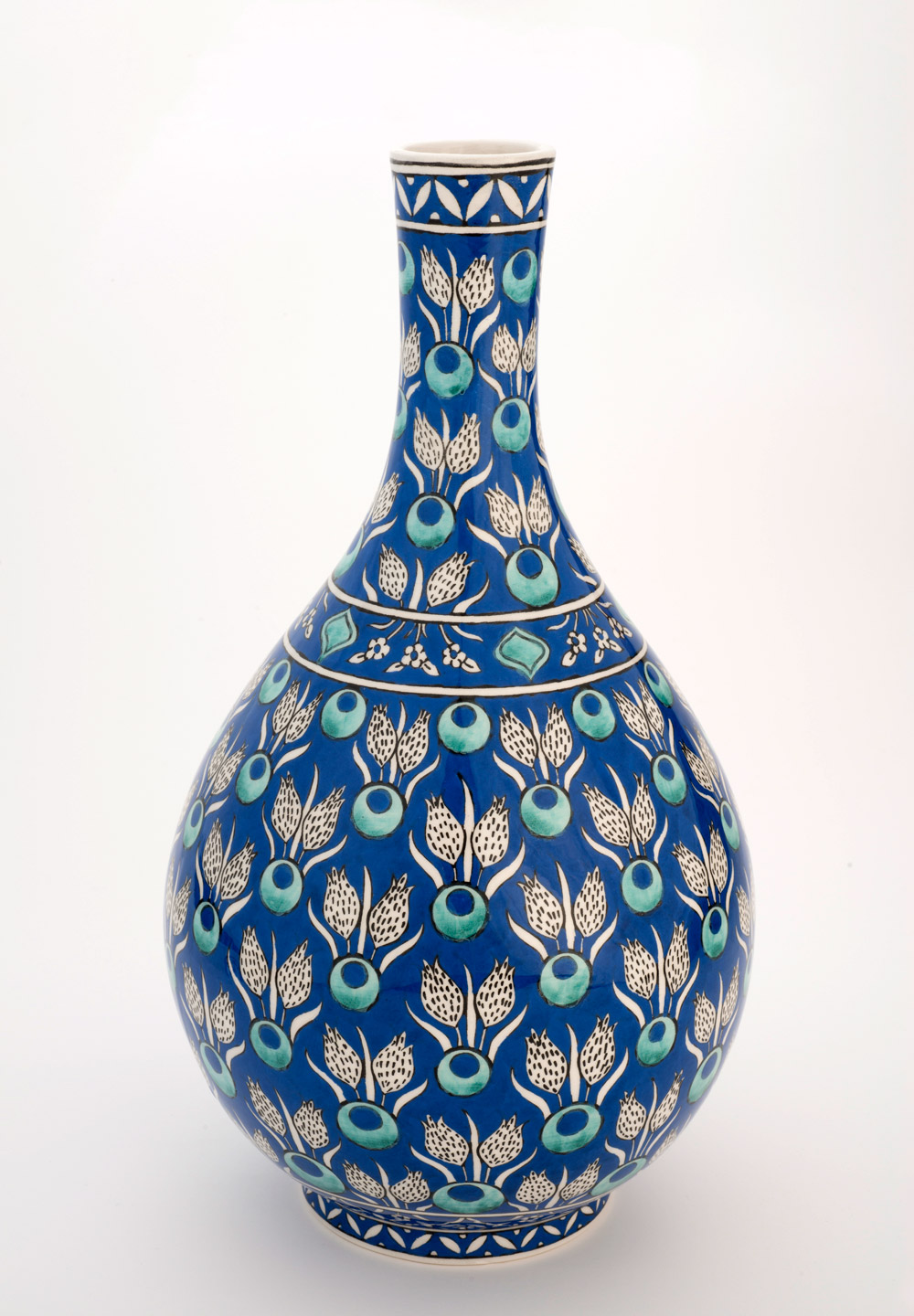 Designed by Be.St koleksiyonunda yer alan bu görkemli seramik su şişesinin 1886 tarihli orijinali bilezik boyunlu ve daha şişkin gövdelidir. Şişe Victoria&Albert Müzesinde sergilenmektedir. İznik çinileri 19. Yüzyılda Avrupa’da prestijli birçok atölyeye ilham kaynağı olmuştur. Bu atölyeler orijinal İznik çinilerinin çok kaliteli replikleri ile ünlenmişlerdi. Designed by Be.St koleksiyonunda bulunan şişe o dönemde Floransalı Cantagalli atölyesinin yaptığı ince uzun boyunlu 1890 tarihli şişeden ilham alınarak tasarlandı. Şişe’nin alt yapısı İznik’te altın çağını yaşamış Türk Seramik Sanatı geleneğine sadık kalınarak, Osmanlı döneminde yapıldığı gibi kalıplama ve şablon kullanılmadan, geleneksel çark tornasında büyük ustalık, bilgi birikimi ve derin tecrübe gerektiren el işçiliği ile şekillendirildi. İleriki yıllarda antika obje olarak değerlendirilebilecek olan bu kıymetli şişenin süslemesinde Natüralist üslup ile Çintemani motifleri uyum içinde kullanılmıştır. Bu şişenin orijinali halen özel bir koleksiyonda bulunmaktadır.